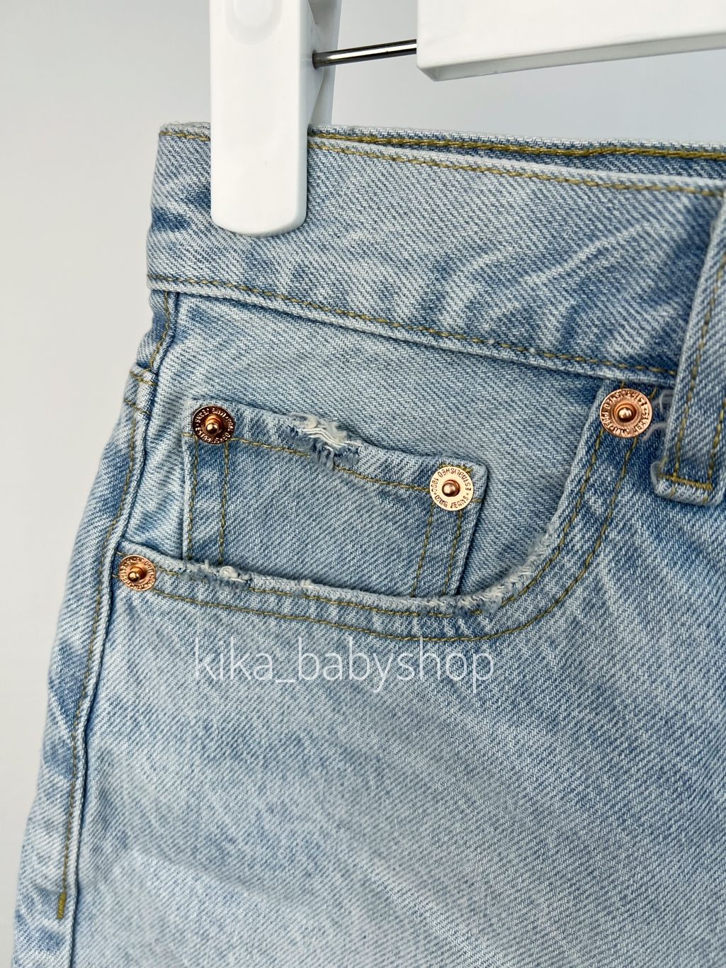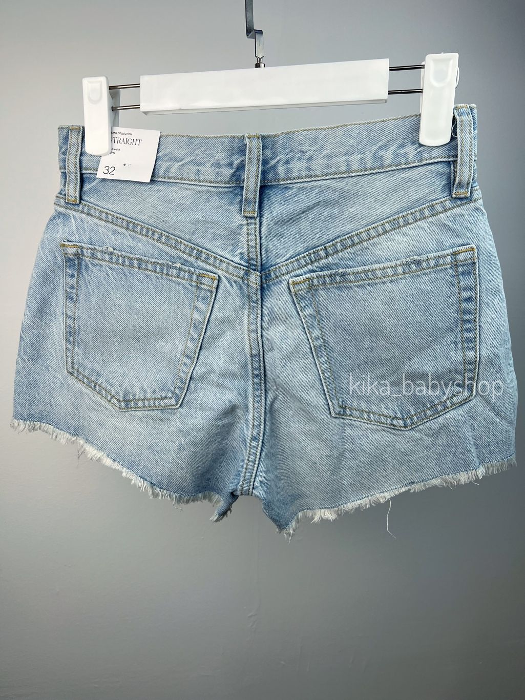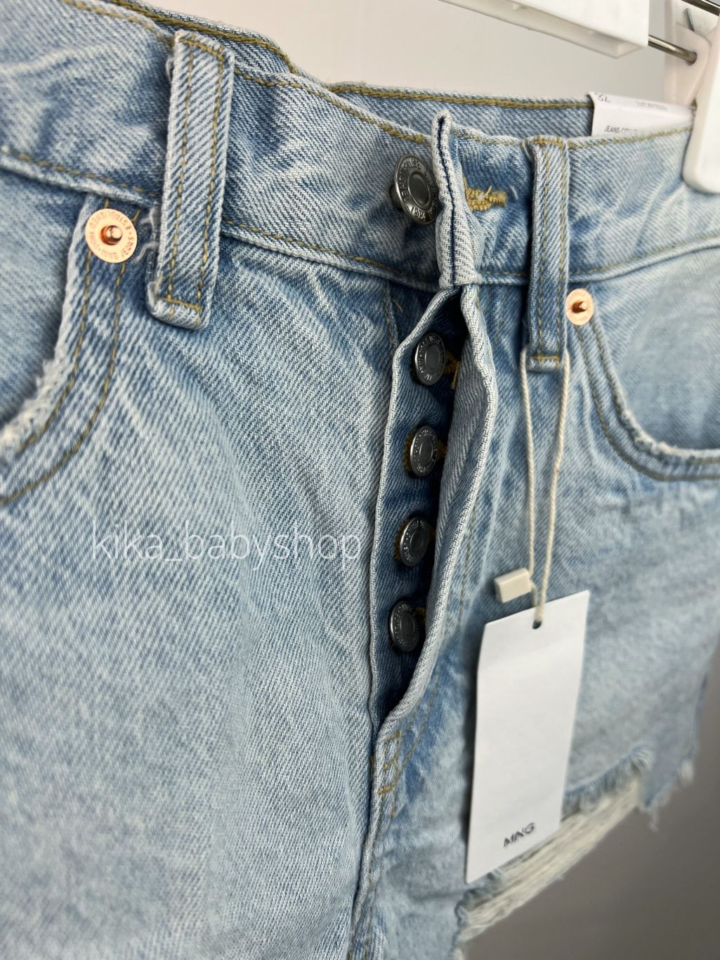 Бавовняна тканина в стилі джинс. Короткий дизайн. Прямий крій. Середня посадка. Петлі для ременя. П'ять кишень. Застібка на ґудзик і блискавку. Розтріпаний низ.